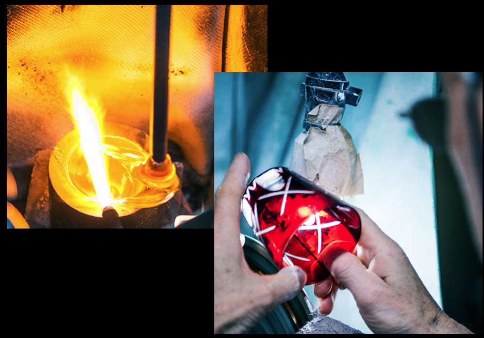 この硝子器は、職人による手吹き工芸の器に、江戸切子伝承の技法と独自の繊細な技法やデザインを加えた、新しい感覚の硝子工芸品となっています。